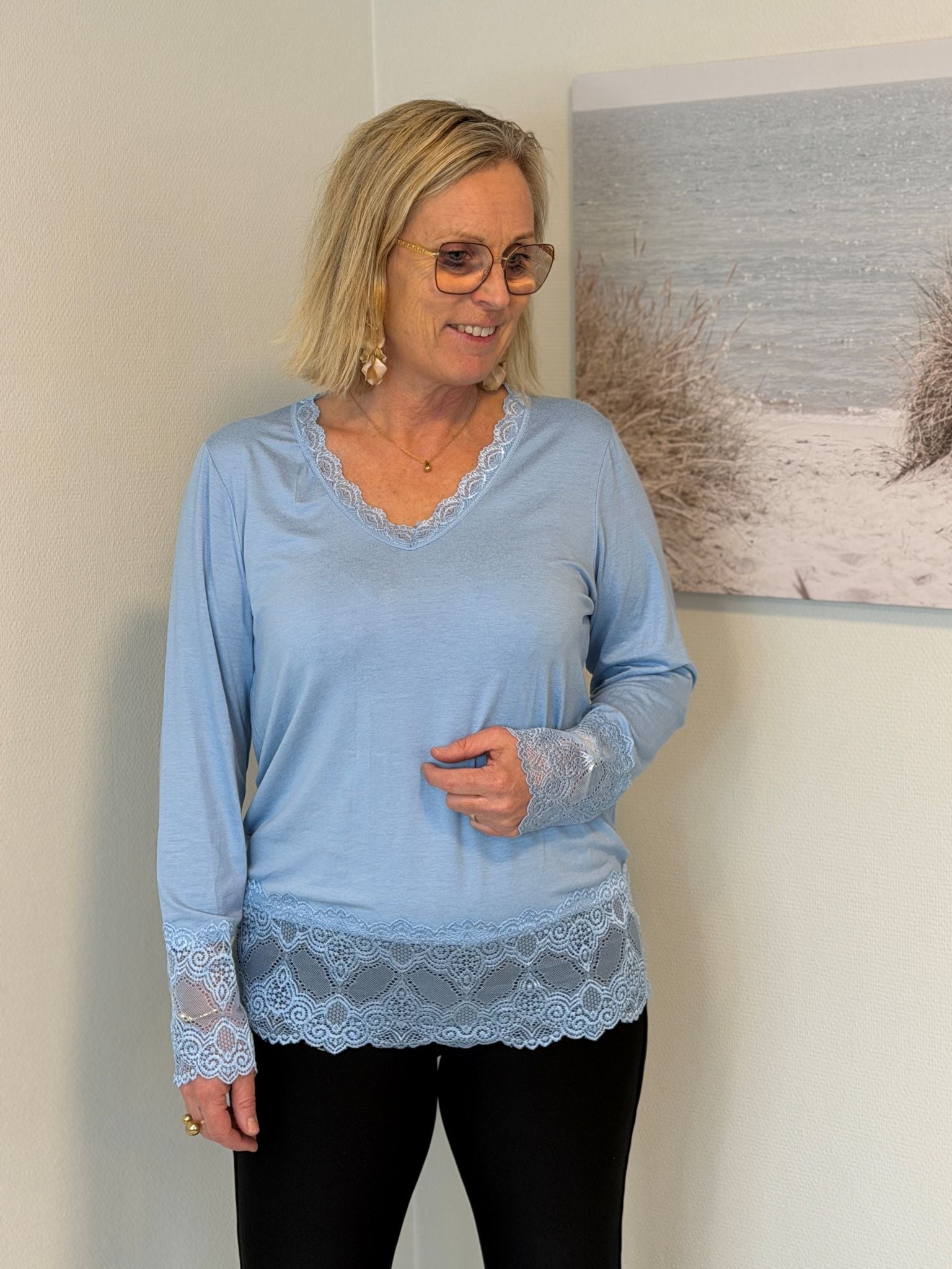 Långärmad topp i onesize med en bred spetskant nertill, i ärmslutet och i V-ringen.